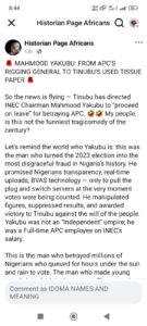 Let’s remind the world who Yakubu is: this was the man who turned the 2023 election into the most disgraceful fraud in Nigeria’s history. He promised Nigerians transparency, real-time uploads, BVAS technology — only to pull the plug and switch servers at the very moment votes were being counted. He manipulated figures, suppressed results, and awarded victory to Tinubu against the will of the people. Yakubu was not an “Independent” umpire; he was a Full-time APC employee on INEC’s salary.