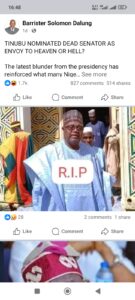TINUBU NOMINATED DEAD SENATOR AS ENVOY TO HEAVEN OR HELL? By Barrister Solomon Dalung