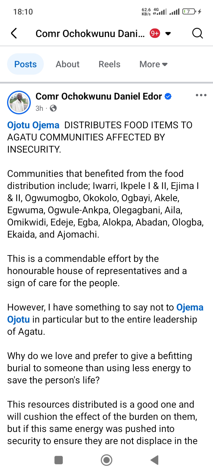 Ojotu Ojema has distributed food items to communities in Agatu affected by insecurity, including Iwarri, Ikpele, Ejima, and others. While the effort is commendable, Comr Ochokwunu Daniel Edor, Convener of Agatu National Youth Council (ANYC), questions the priorities of Agatu leaders.