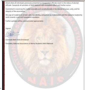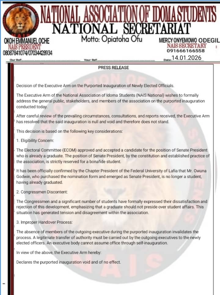 The Executive Arm of the National Association of Idoma Students (NAIS National) wishes to formally address the general public, stakeholders, and members of the association on the purported inauguration conducted today.
