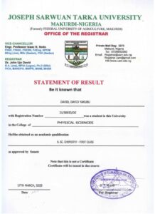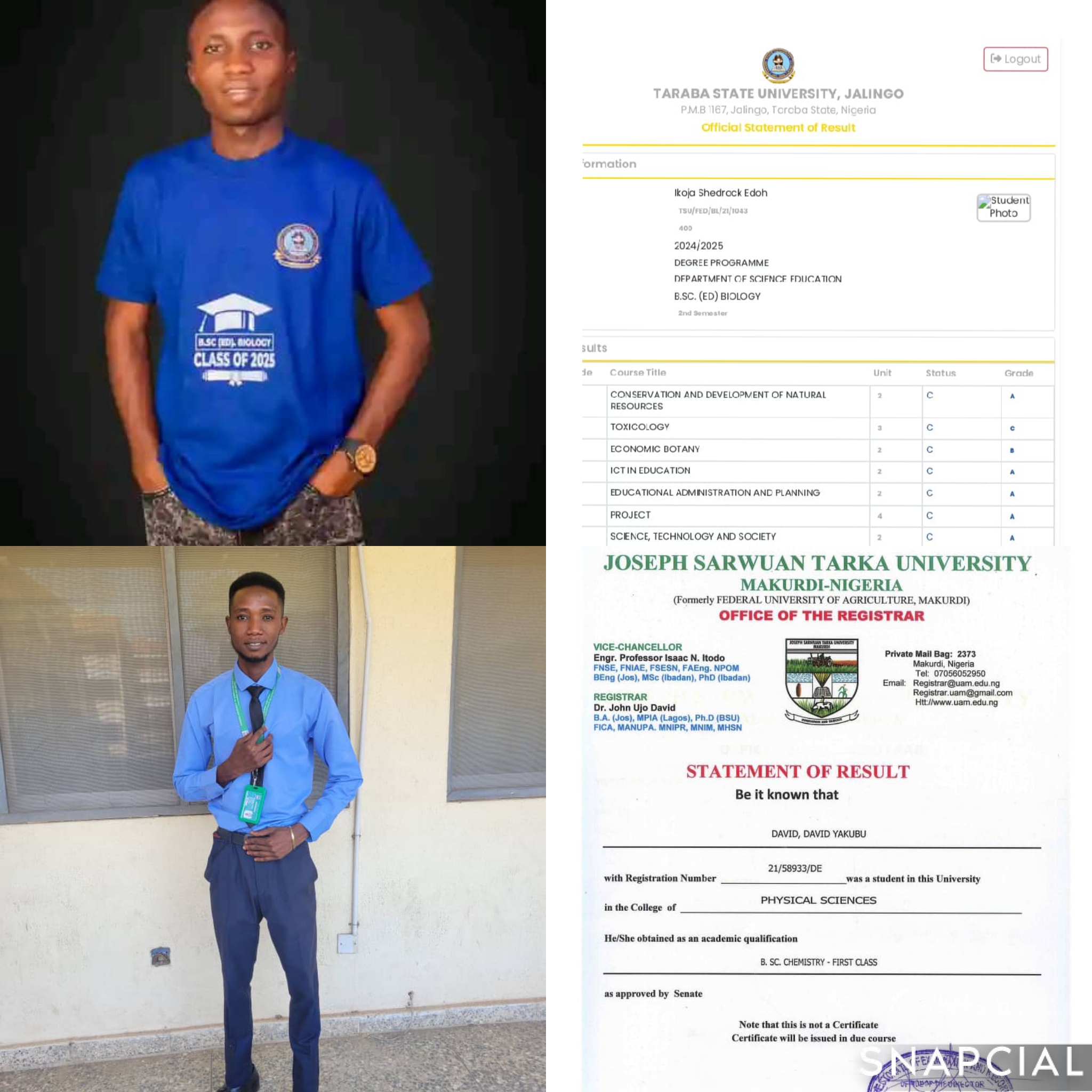 Ikoja Shedrack Edoh, a Biology Education graduate from Taraba State University, and David Yakubu, a Chemistry graduate from University of Agriculture (Joseph Tarka University), both achieved first-class honors.