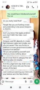 The Agatu National Youth Council leader, Comr Ochokwunu Daniel Edor denies supporting either Egba or Ologba, stating he stand for justice. He question the individual’s claim that AdogojI clans are orchestrating the conflict, citing it as unlikely, given AdogojI’s strength and numbers.