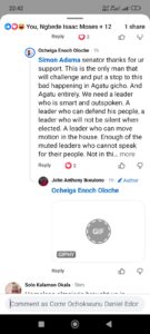 “Simon Adama Senator, thanks for ur support. This is the only man that will challenge and put a stop to this bad happening in Agatu,” Ocheiga reechoed. He emphasized the need for a leader who can speak up and take action, rather than remaining silent.