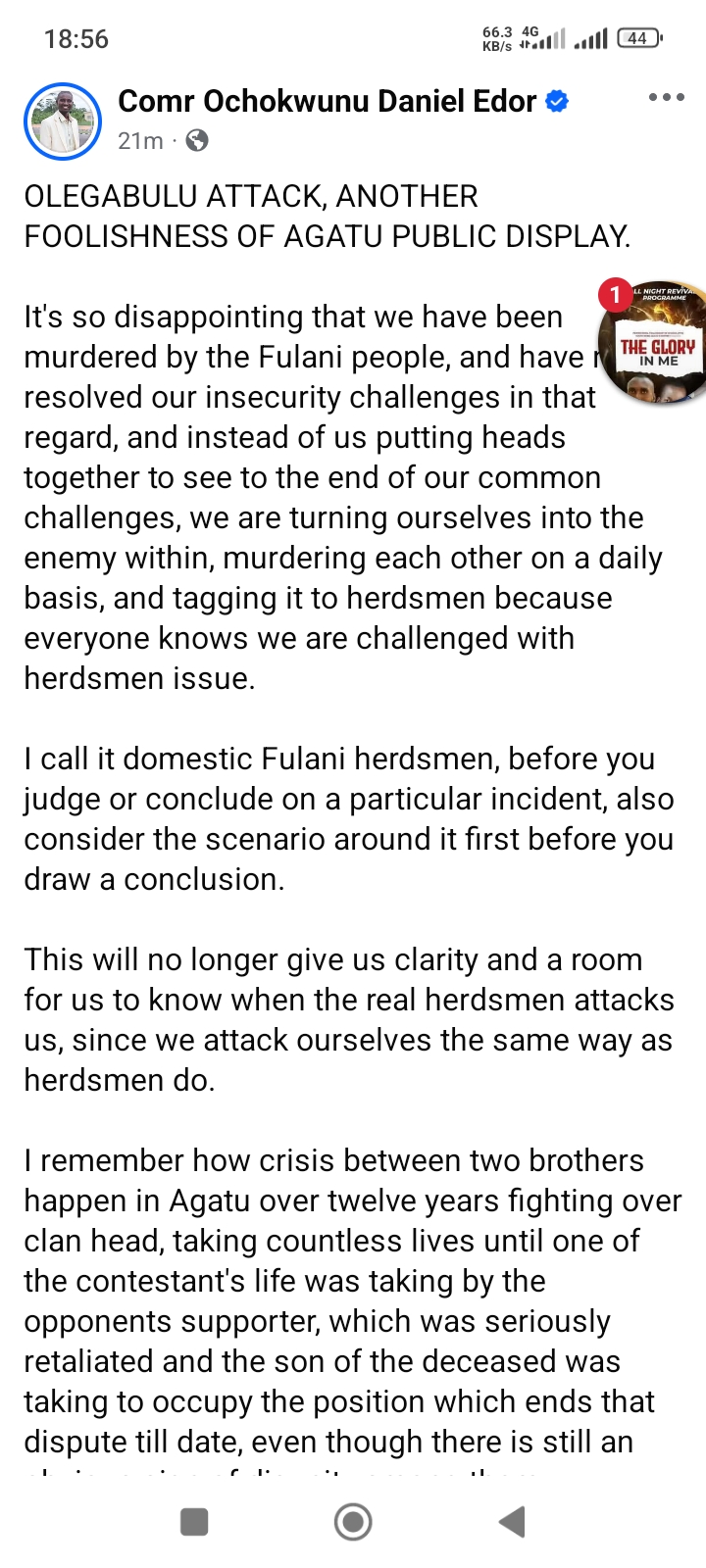 Comr Ochokwunu Daniel Edor has condemned what he described as “foolishness of Agatu public display” following the recent attack in Olegabulu, warning that Agatu is fast losing the ability to distinguish between external aggression and self-inflicted wounds.